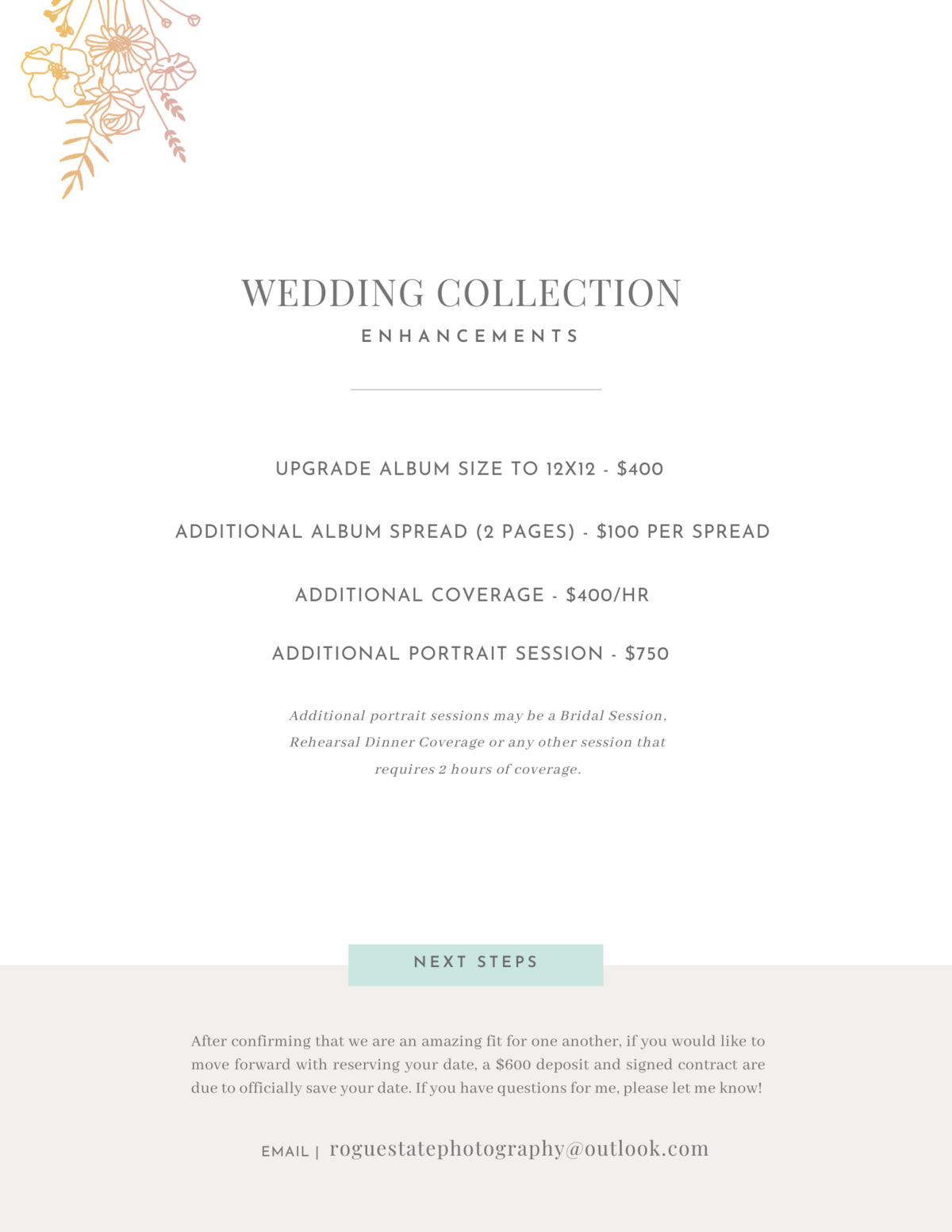 This guide has been meant to give you an overview of what I am offering for you wedding day, and what makes the experience working with me, so special! But as always, I am here to answer any questions for you at any time. Just send me an email and I'll get back to you ASAP. Thank you so much!